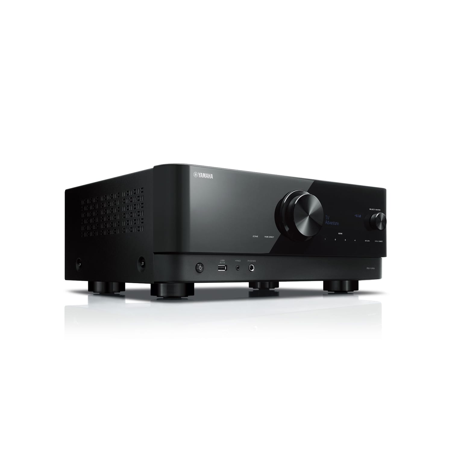 V4A – Receptor AV de 5.1 canales con CINEMA DSP 3D, HDMI™ 4-entradas/1-salida, envolvente inalámbrico. Sonido envolvente potente de 5.2 canales Wi-Fi, Bluetooth®, AirPlay 2, Spotify Connect y audio multiroom MusicCast Función de juego dedicada (ALLM, VRR, QMS, QFT) mediante actualización de FW Control por voz con dispositivos Alexa y Google Assistant. *La disponibilidad varía según la región Compatible con MusicCast Surround: agregue altavoces MusicCast 20 o MusicCast 50 para crear un sonido envolvente inalámbrico Audio HD con CINEMA DSP 3D Optimización de sonido YPAO™